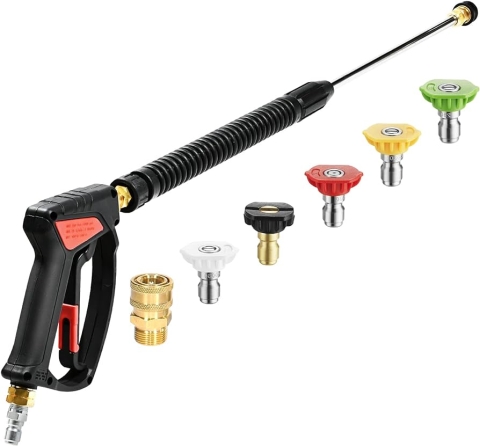 Pressure washer guns are an attachment designed to aid in cleaning by intensifying the water stream from a garden hose or an electric or gas-powered pressure washing machine. This device is necessary for controlling the high-pressure water stream and detergents when cleaning things like a car, pavement, or other dirty and tough-to-reach surfaces.